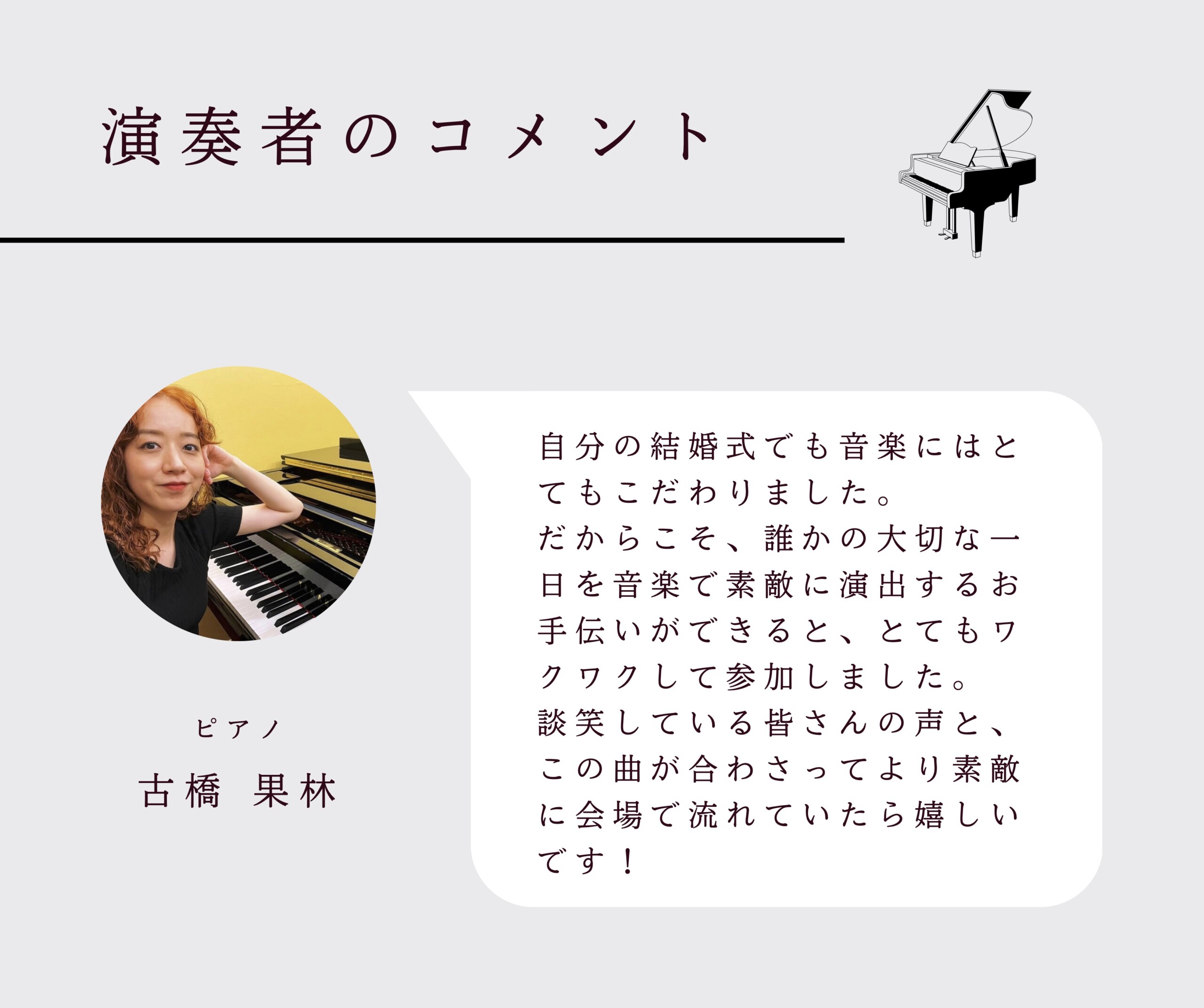 古橋さんによる感動的なピアノソロは、特に披露宴の後半、お手紙を読むシーンなどにぴったりです。